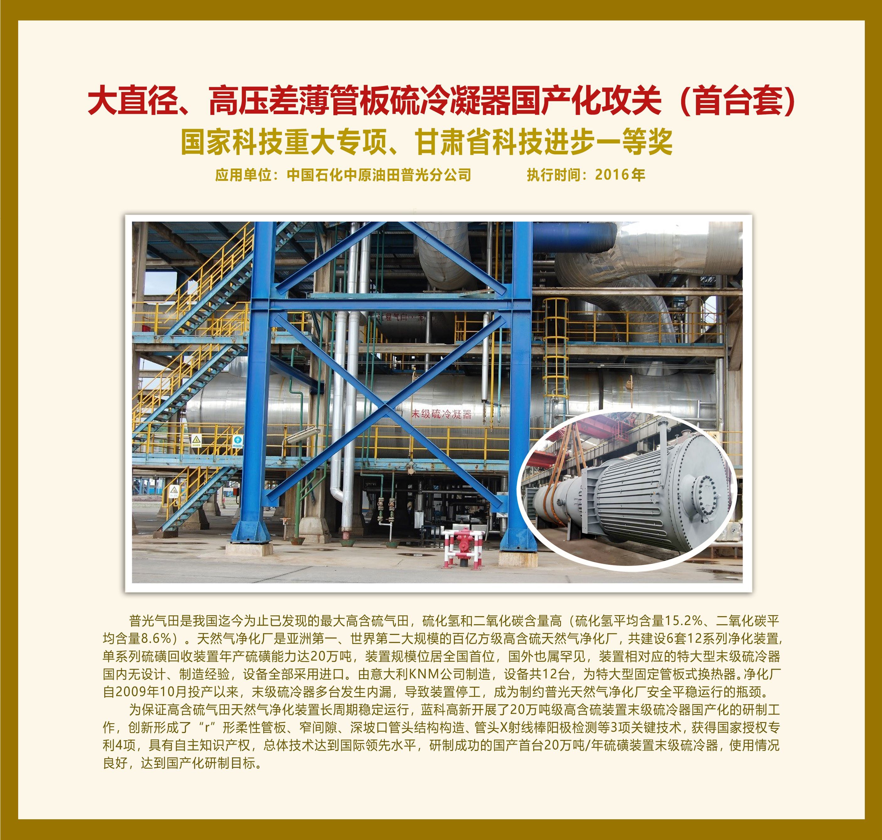 大直徑、高壓差薄管板硫冷凝器國產(chǎn)化攻關(guān)(首臺套)國家科技重大專項、甘肅省科技進(jìn)步一等獎